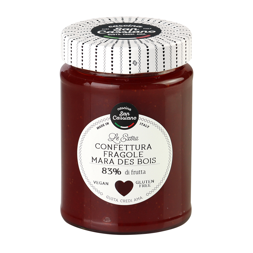 Confettura dal gusto raffinato e dal profumo intenso, è preparata con una pregiata varietà di fragola di origine francese e zucchero di canna. La “Mara des Bois ” è ricca di vitamine e minerali, ha proprietà antiossidanti e un sapore simile alle fragoline di bosco. Confettura perfetta per farcire dolci e guarnire gelati; è ottima spalmata sul pane o per accompagnare i formaggi.
