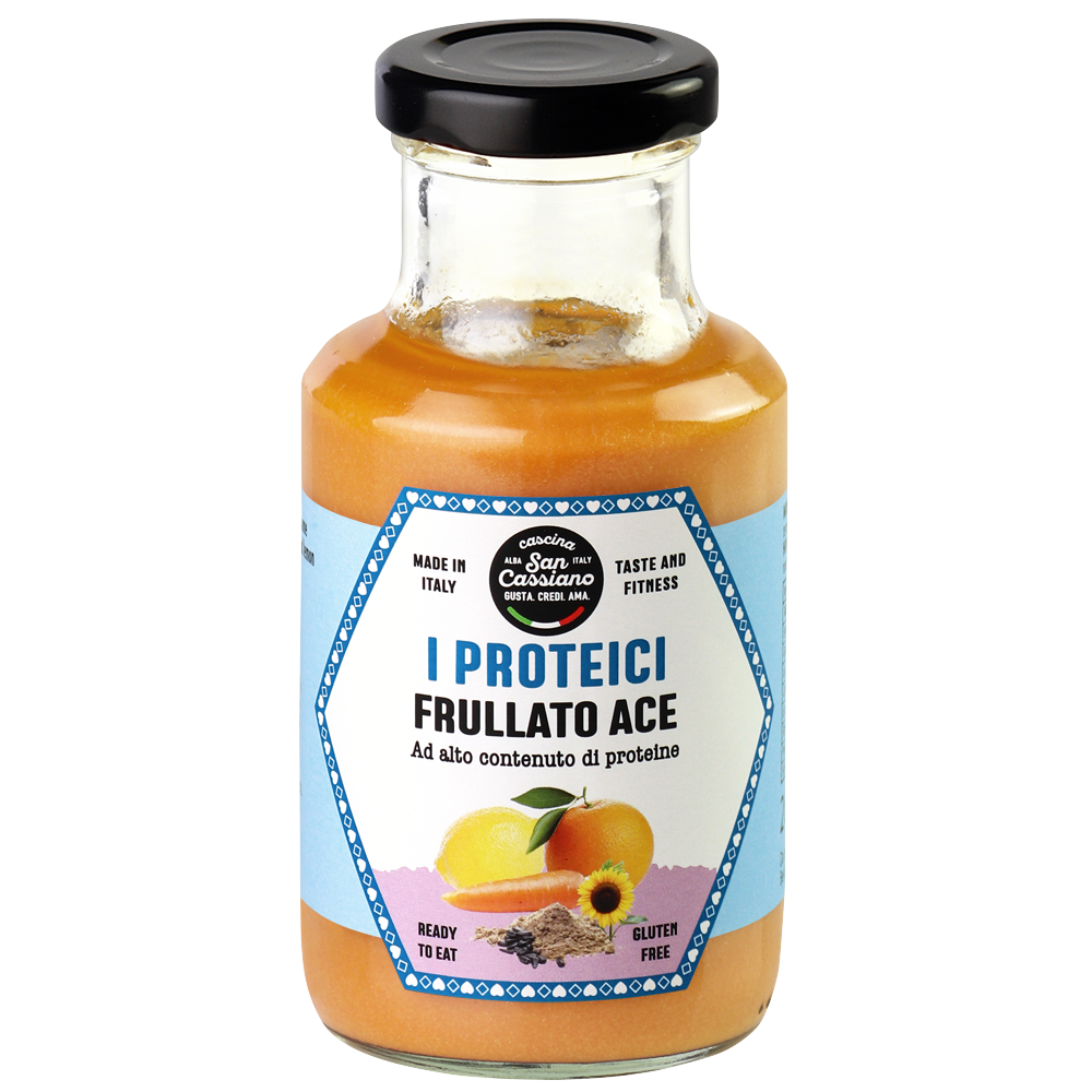 Dissetante frullato proteico preparato con arance, carote, limone, mosto d’uva e l’aggiunta di proteine vegetali di girasole, senza latte. Leggero, con poche calorie ha un gusto agrumato molto piacevole nei periodi estivi e non appesantisce. Adatto agli sportivi e perfetto come intermezzo, snack post allenamento o durante le escursioni o per la prima colazione.