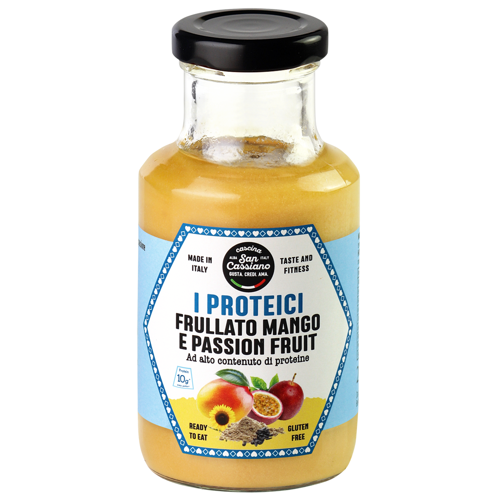 Frullato proteico preparato con mango, frutto della passione, mosto d’uva e l’aggiunta di proteine vegetali di girasole, senza latte. Questo frullato molto aromatico dal gusto intenso e note esotiche, contiene poche calorie e non appesantisce. E’ perfetto come intermezzo, snack post allenamento, per la prima colazione o come cibo da asporto durante le escursioni.
