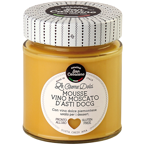 Vellutata crema dolce preparata con vino Moscato d’Asti D.O.C.G.. Ideale per guarnire torte, dolci, biscotti e gelati.