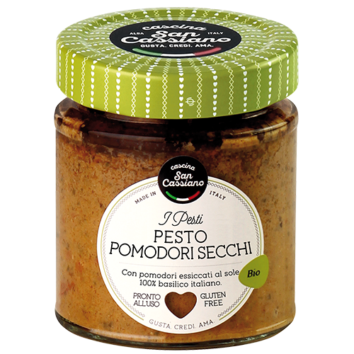 Pesto biologico preparato con un’alta percentuale di basilico e pomodori secchi. Ideale per condire primi piatti a base di pasta o secondi a base di pesce. Ottimo per accompagnare carni alla griglia.