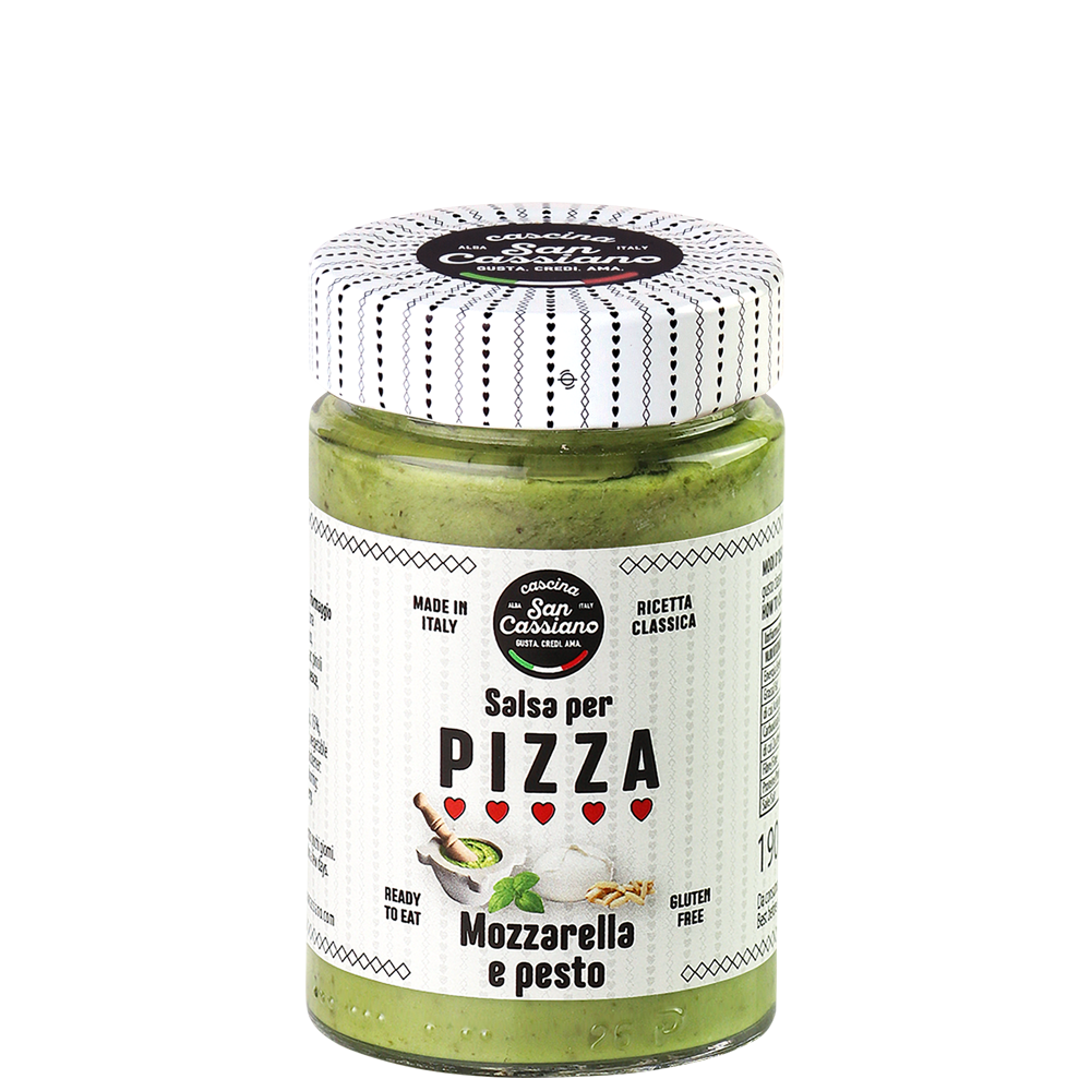 Salsa dal gusto fresco e aromatico preparata con basilico e pinoli pestati e con aggiunta di Mozzarella. E’ ideale per realizzare una pizza bianca originale e appetitosa, subito pronta da cuocere in forno pochi minuti. E’ ottima anche con l’aggiunta di gamberetti o come base per tartine.